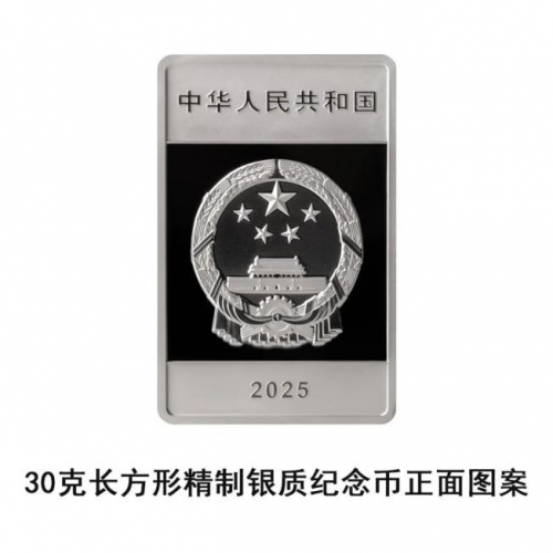 30克长方形银质纪念币为精制币,含纯银30克,规格42毫米×27.5毫米,面额10元,成色99.9%,最大发行量8×3000枚。