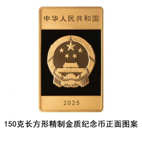 150克长方形金质纪念币为精制币,含纯金150克,规格64毫米×40毫米,面额2000元,成色99.9%,最大发行量300枚。